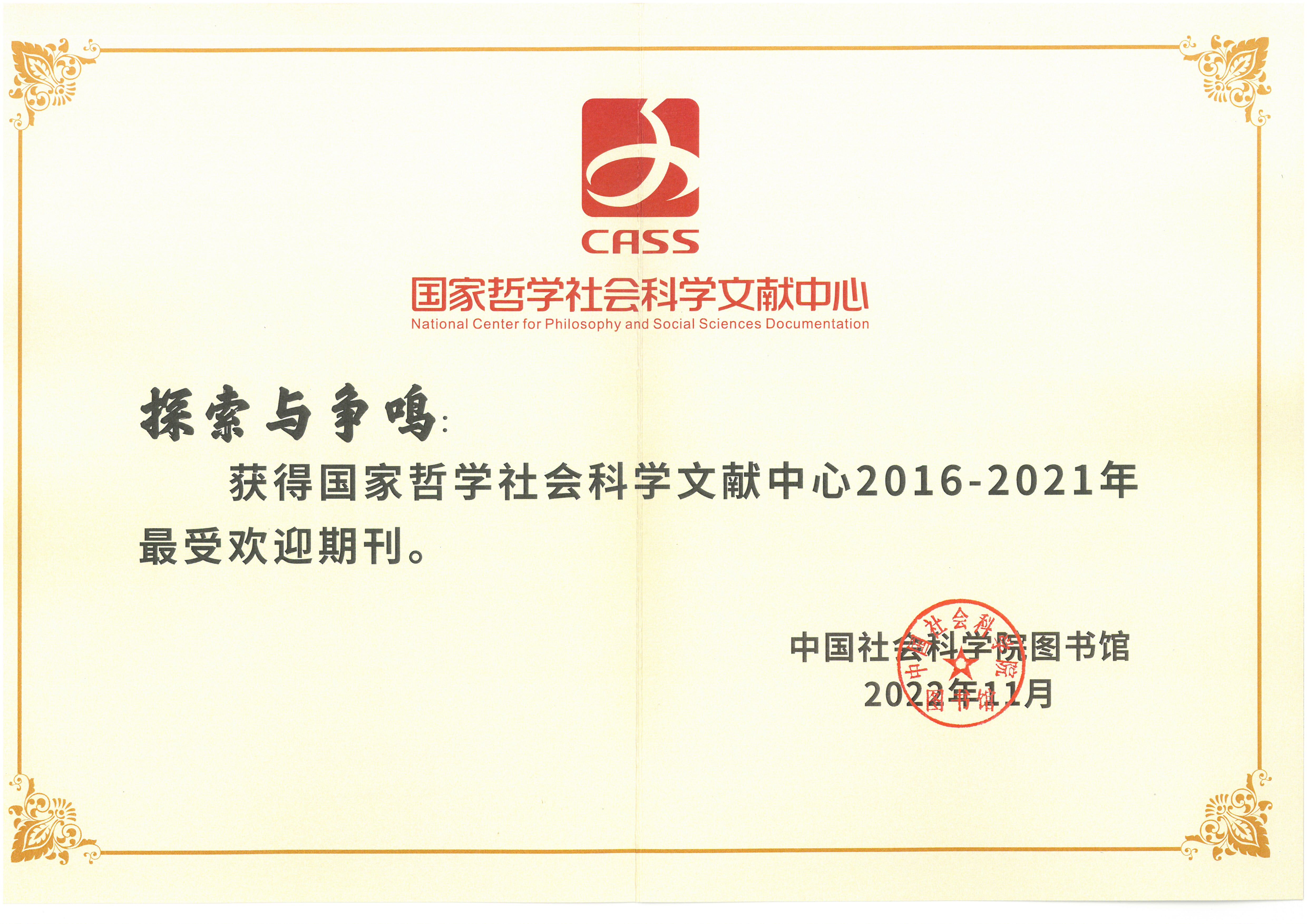 近日, 根据中国社会科学院图书馆发布的《国家哲学社会科学文献中心建设成果报告(2016-2022年)》和《国家哲学社会科学文献中心中文期刊用户关注度报告(2021年度)》,《探索与争鸣》同时获评“国家哲学社会科学文献中心2016-2021年最受欢迎期刊”和“国家哲学社会科学文献中心2021年度综合性人文社会科学最受欢迎期刊”。