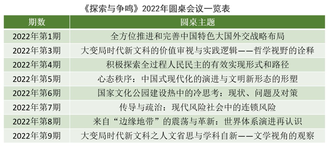 《探索与争鸣》品牌栏目“圆桌会议”,每期精心策划当前比较值得关注的话题,邀请6-10 位各领域知名专家,召开小型座谈会,从不同学科、不同视域进行探讨,最终形成每人4000 字左右的观点文章。“圆桌会议”栏目始于1994年,是《探索与争鸣》最早的品牌栏目之一。