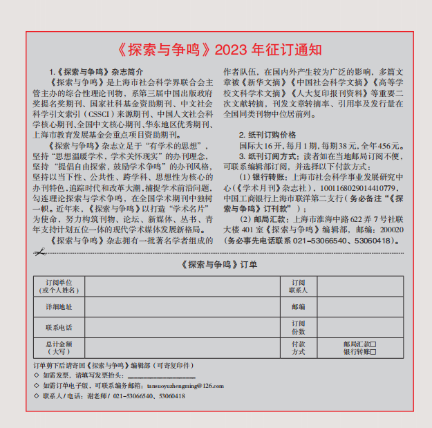 (务必备注“《探索与争鸣》订刊款”,事先电话联系021-53066540、53060418)。