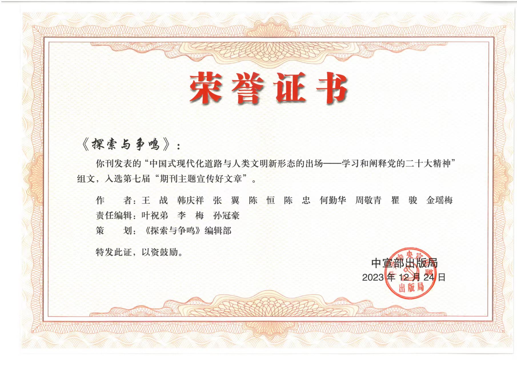 近日,由中宣部出版局主办、中国期刊协会承办的第七届“期刊主题宣传好文章”推荐活动遴选出100篇(组)拟推荐作品,《探索与争鸣》发表的“中国式现代化道路与人类文明新形态的出场一一学习和阐释党的二十大精神组文,入选第七届“期刊主题宣传好文章”。