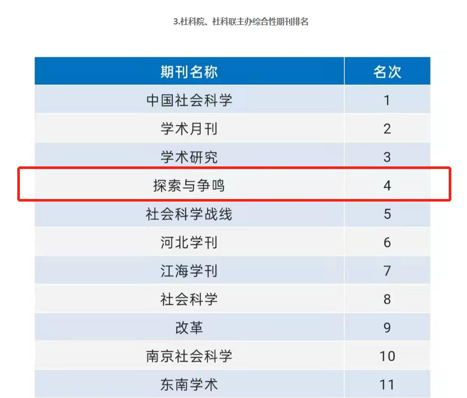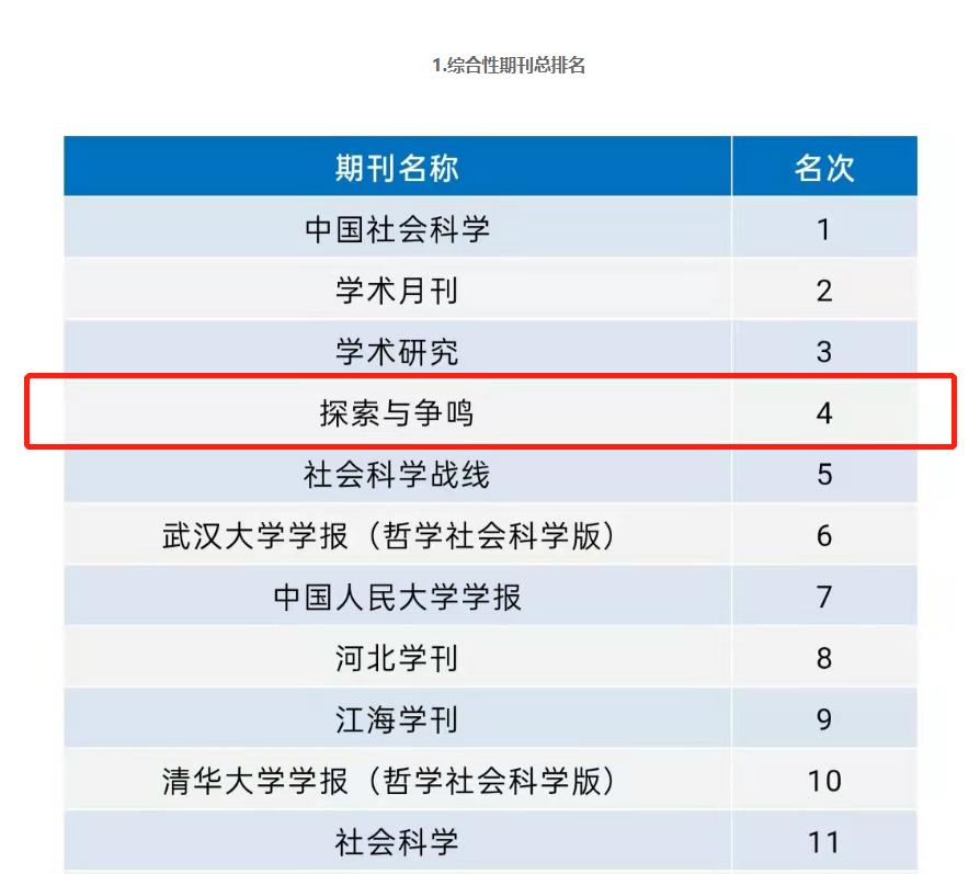 今年,在“综合性期刊总排名”和“社科院、社科联主办综合性期刊排名”中,《探索与争鸣》均位列第4名,名列前茅,表现优异!