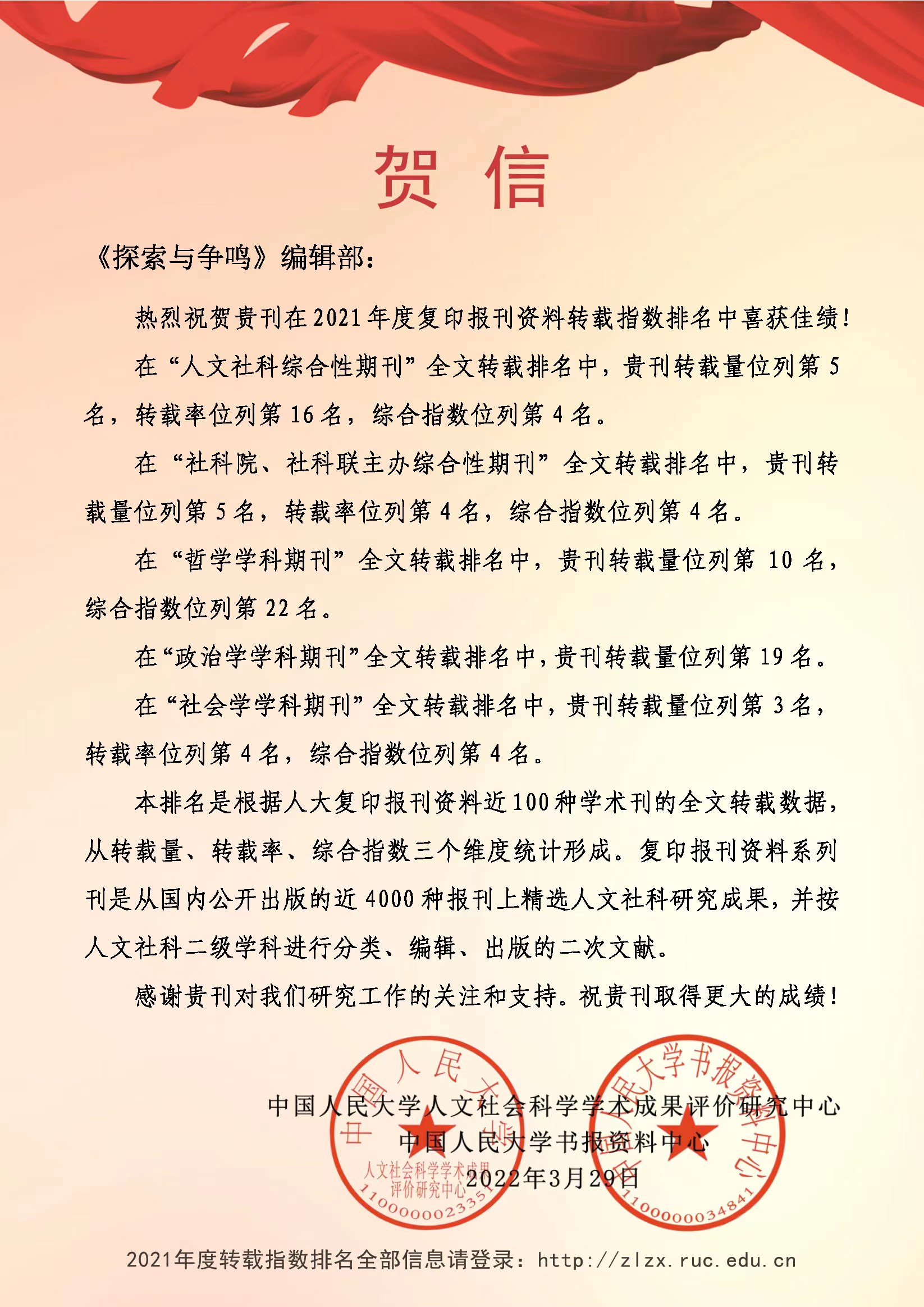 祝贺《探索与争鸣》在2021年度复印报刊资料转载指数排名中喜获佳绩!